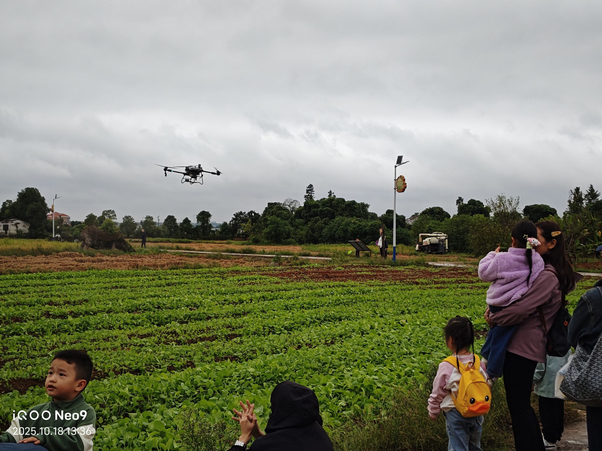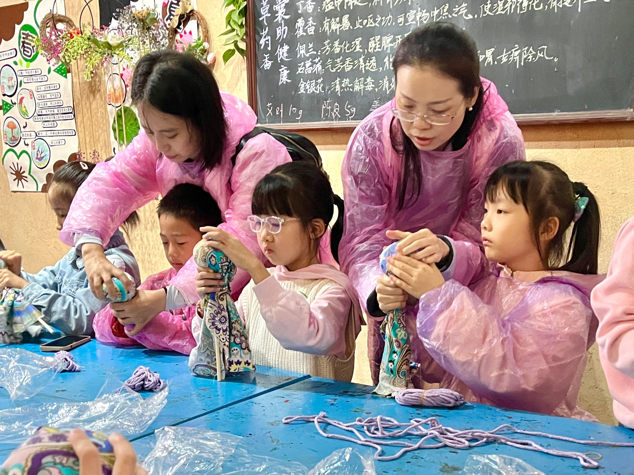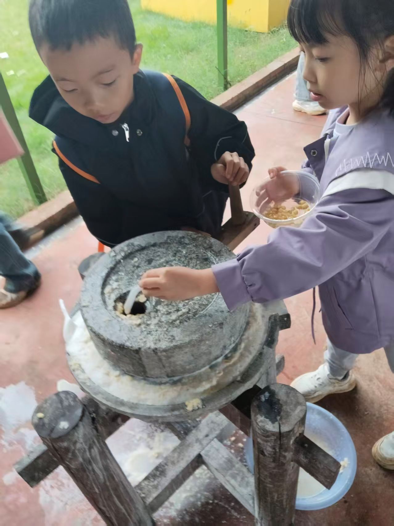 本次活动以教职工家庭为单位,按不同的年龄段进行分组,活动内容设计兼具趣味性与实践性。在研学老师的带领和指导下,小宝宝们在“五彩溜溜布”上爬行嬉戏,感受色彩与空间的新奇;大宝贝们化身“抢收小能手”,体验传统农具的生活乐趣;家长和孩子们合作“大地挖红薯”,感受农耕劳作的辛劳与收获的喜悦;跟着节奏“学跳竹竿舞”,在踏步与欢笑中体验传统舞蹈魅力;亲手制作“艾草香锤” 和“石磨豆浆”,充满了传统手工艺的温馨与智慧;观看“科技新农人”无人机农作模拟,感受科技赋能农业的魅力。活动项目从游戏、劳作、体验到手工、科普,让文化、农耕在亲身实践中落地生根,活动过程亲子配合默契,场面温馨而热烈。