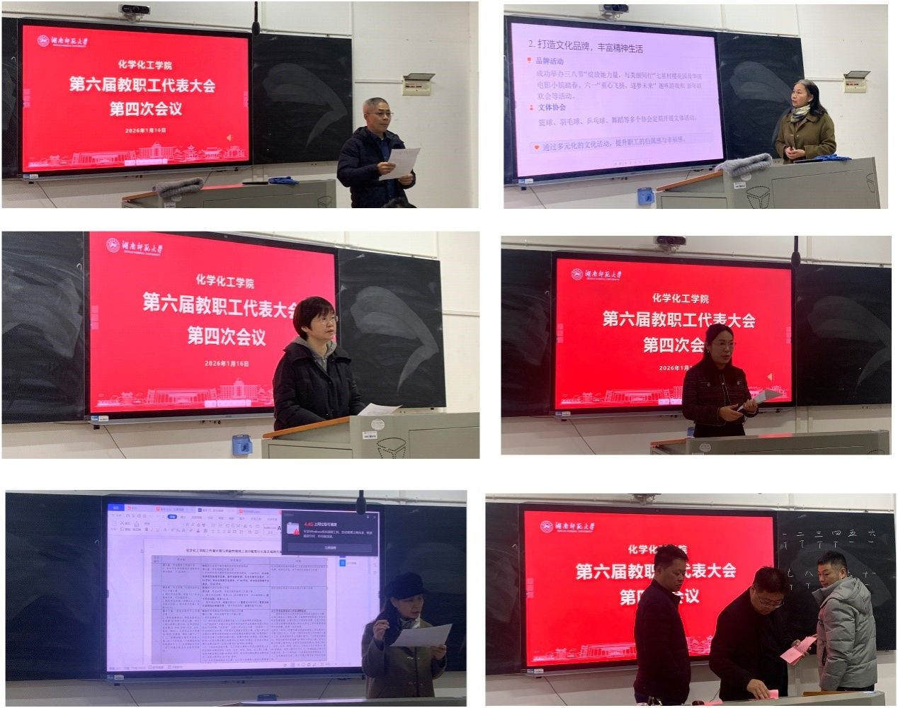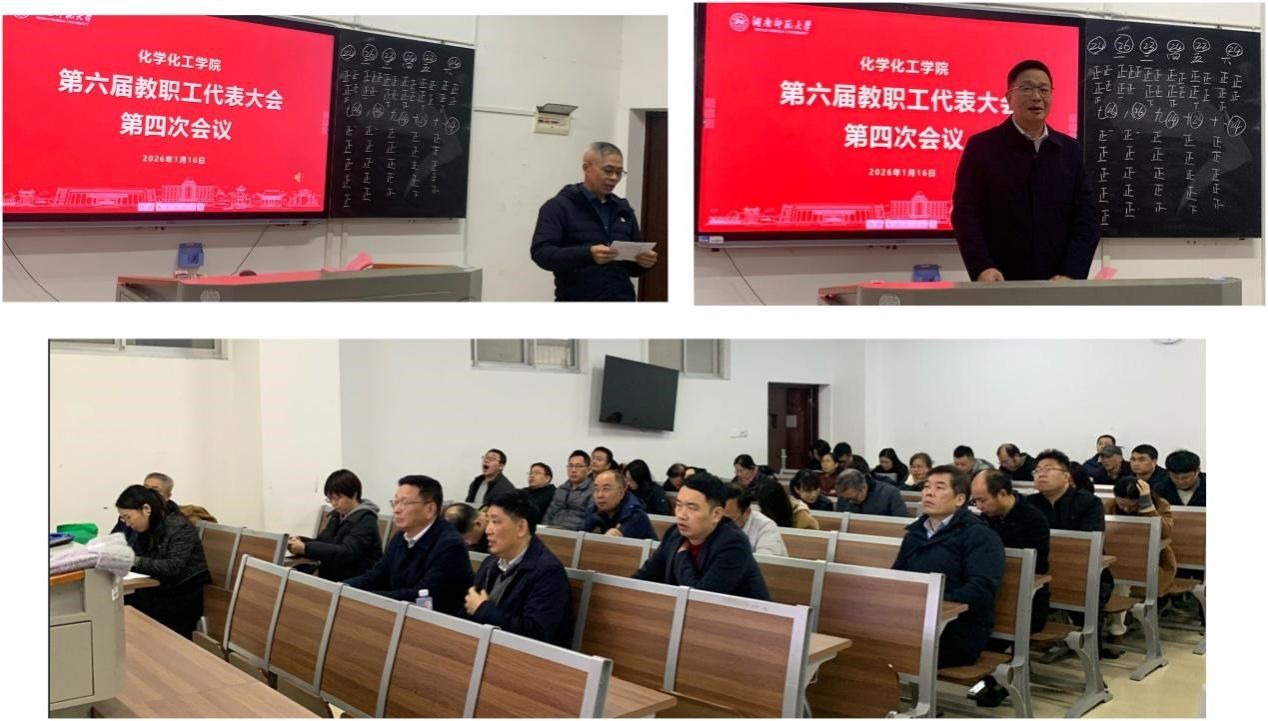 (化学化工学院 周明波)1月16日上午,化学化工学院第六届教职工代表大会第四次会议在化学楼117教室举行。学院党委书记谭东波、院长杨荣华,副院长谭亮、宋春红、谭蓉及工会主席余丽萍出席会议。会议由工会副主席梁云主持。