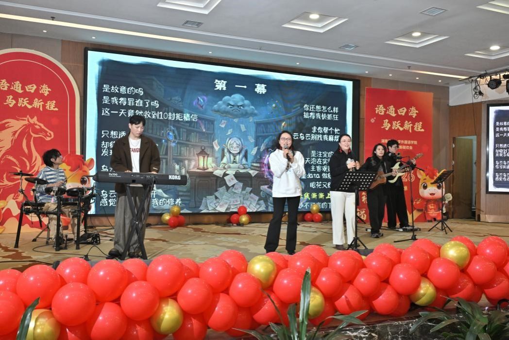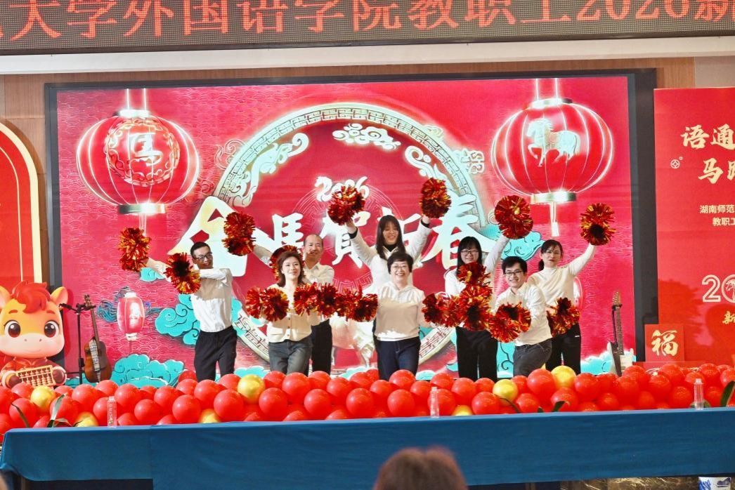 联欢会节目精彩纷呈,形式多样。学院工会干部们以一段活力四射的开场舞《新年大吉》为大家开启一整年的祝福;贾艳芳、任海燕等老师与一颗苹果乐队联袂献上小合唱与乐队表演《2026创造至上 见刊快乐》,展现了激情与创造力;学院领导班子成员则一改平日严肃,带来欢乐歌舞《最炫民族风》,引来阵阵掌声与欢笑。卢锦淑、王佳丽等十四位老师表演的《八段锦》刚柔并济,韵味十足;戴霁斌、胡云天、杨欣雨、李沁四位老师的小合唱《故湘风》深情款款,寄托乡愁;梁斌、侯奇焜、段农乾老师携手体育学院博士生带来的《沧海一声笑》小合唱与武术表演则飘逸恢宏,尽显豪情。杨雨箫、阳凌艺等五位老师带来的流行歌舞《蛋饺肉丝Danger Rose》活力四射,点燃青春激情。压轴登场的是由曾艳钰、陈敏哲等十五位教授组成的豪华阵容,他们的小合唱《如愿》深情而磅礴,唱出了对教育事业、美好生活与家国情怀的深切期盼,感人至深。