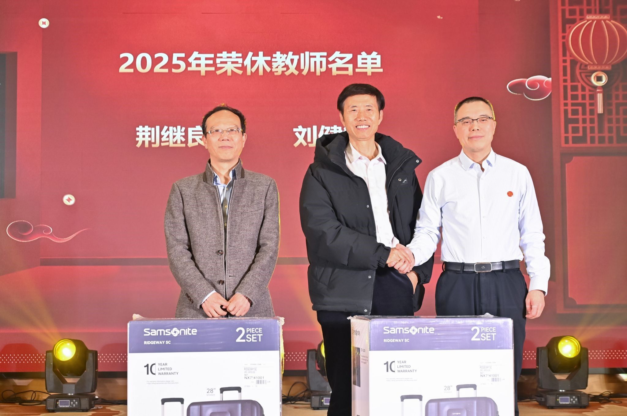 联欢会由周新星教授、翟亚新教授主持,在庄重温馨的教师荣休仪式中正式拉开帷幕。“三尺讲台育桃李,一生坚守铸师魂”,主持人深情致辞,致敬深耕教坛、默默奉献的荣休教师。荆继良教授、刘健智教授上台接受全体师生的敬意与祝福,他们用岁月与智慧照亮了无数学生的成长之路,现场掌声雷动,满含不舍与崇敬之情。